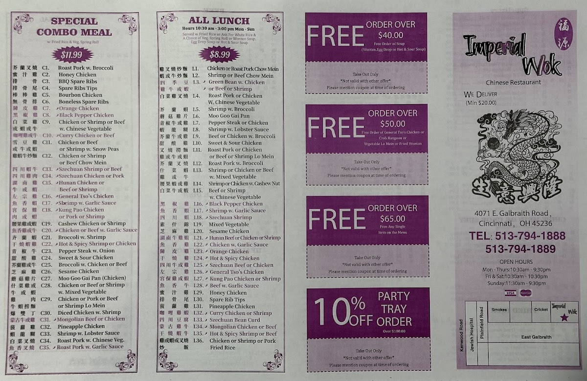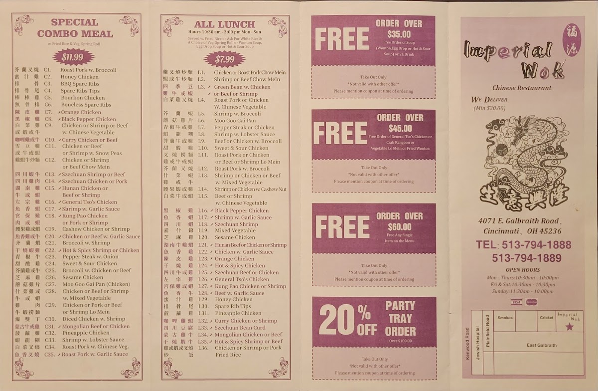 When you're looking for delicious and authentic Chinese cuisine in Cincinnati, look no further than the Imperial Wok Menu. This hidden gem offers a variety of mouthwatering dishes that are sure to satisfy any craving. Whether you're in the mood for flavorful stir-fries, savory noodles, or hearty soups, there's something for everyone here. The menu features a mix of traditional favorites like sweet and sour chicken, kung pao shrimp, and beef with broccoli, as well as some unique specialties that are exclusive to this spot. If you're a fan of classic Chinese dishes prepared with fresh ingredients and bold flavors, you'll find plenty to love at Imperial Wok. Perfect for both casual dinners and family gatherings, this menu offers a diverse selection that is sure to leave you coming back for more.